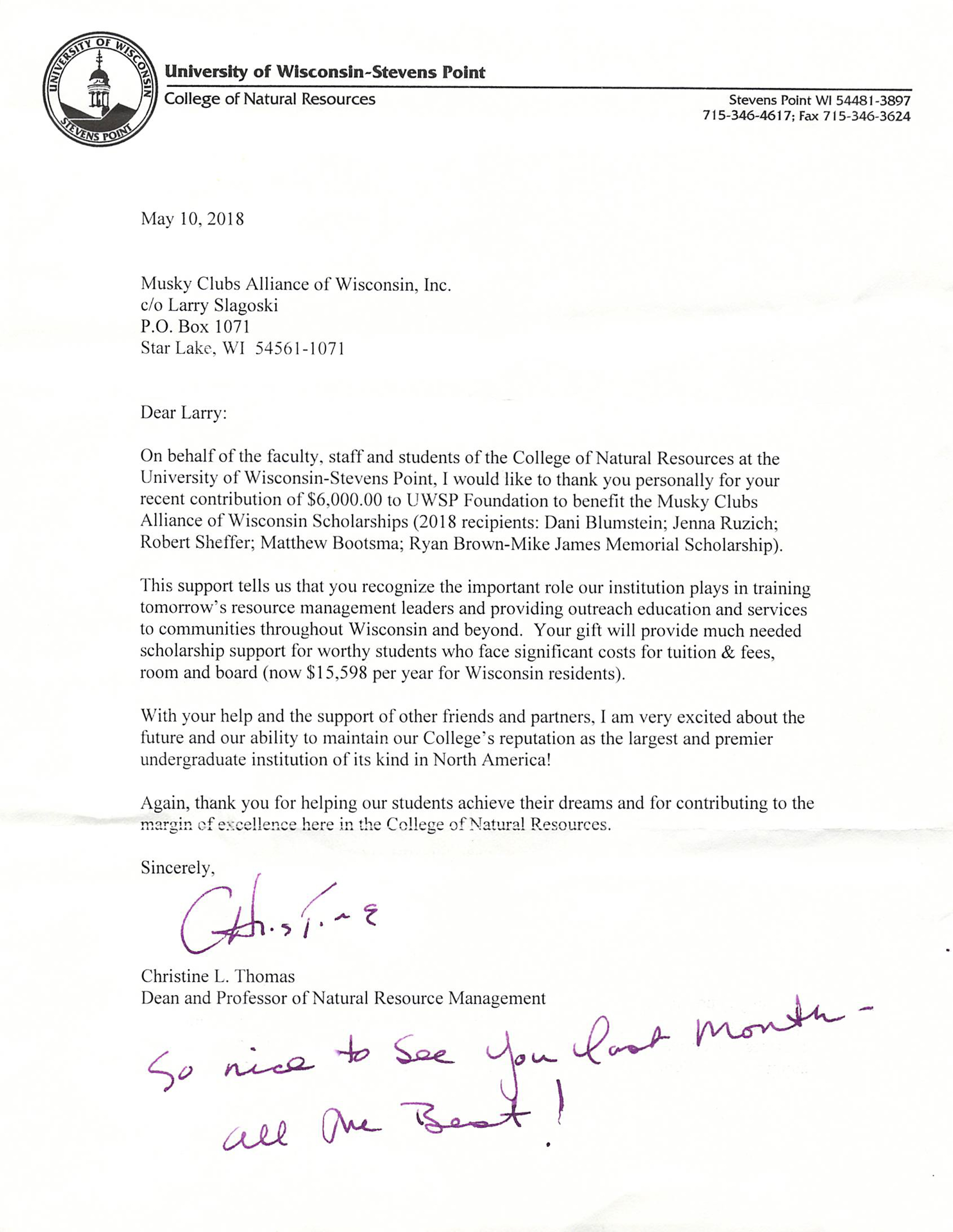 I am truly grateful for the support of the Musky Clubs Alliance of Wisconsin and once again want to thank you for your generous support of my continued education. I strive to continually advance our knowledge of the fisheries that are extremely important to many throughout the State of Wisconsin and this scholarship will assist me greatly in doing so. Once again, I would like to thank you for your generosity and your support in my academic and professional career.